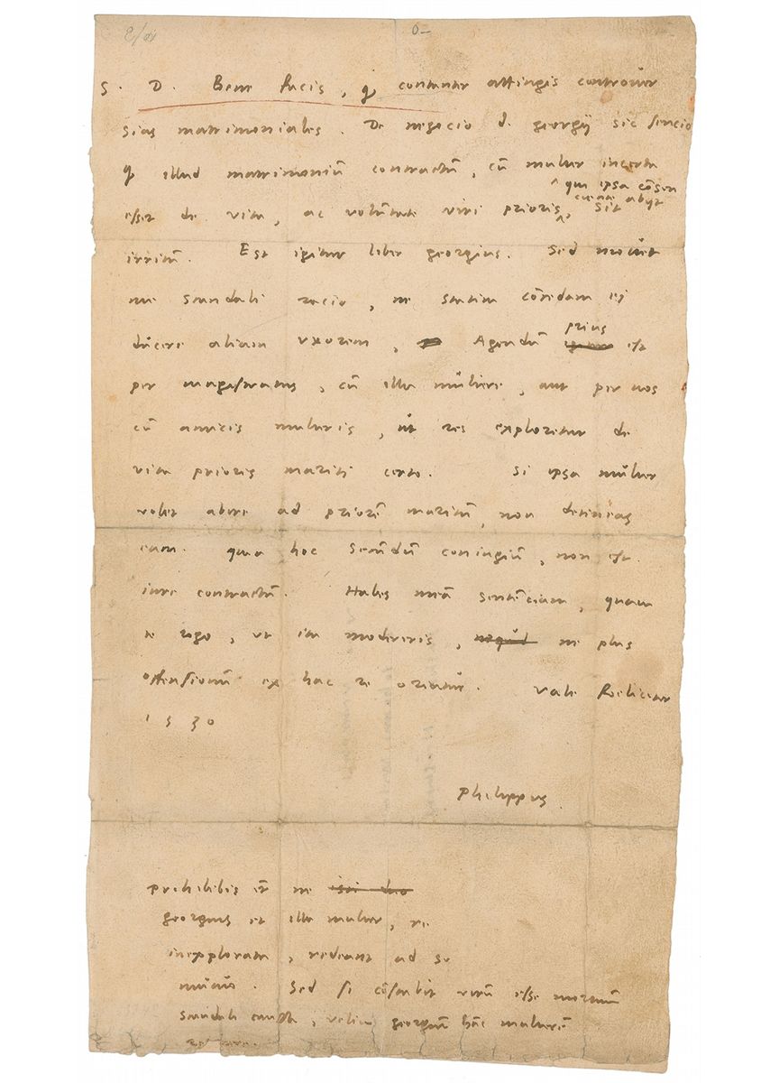 Tremendously influential humanist and scholar (1497–1560) considered the first systematic theologian of the Protestant Reformation; he holds a place beside Luther and Calvin as one of the most important intellectual leaders in religious history. Rare ALS in Latin, signed “Philippus,” one page, 7 x 12.5, March 19, 1530. Letter to Johannes Weber, pastor in Neustadt. In full (translated): “Greetings. You do well in being constantly concerned with matrimonial cases. My view of Georg’s business is that the marriage contracted is invalid, since the woman was uncertain whether her previous husband, who went away with her consent, was alive and what his wishes were. Georg is therefore free, but the scandal moves me not to immediately allow him to take another wife. The magistrates should first make an effort with the woman, or we should do so with the woman’s friends, to find out with certainty whether her previous husband is alive. If the woman herself wants to go away to her previous husband, do not stop her, since this second marriage is not legally contracted. You have my view, which I beg you to moderate in such a way that this matter does not give rise to greater offense. Farewell. Rochlitz, 1530.” He adds a postscript below, in full: “You will also prohibit Georg and the woman from returning to one another without the matter having been investigated, but if he will judge that the husband is dead, I would like Georg to keep the woman, because of the scandal.” Also addressed on the reverse address panel in Melanchthon’s hand. In very good condition, with intersecting folds (with some partial tape-repaired separations), and light soiling.
