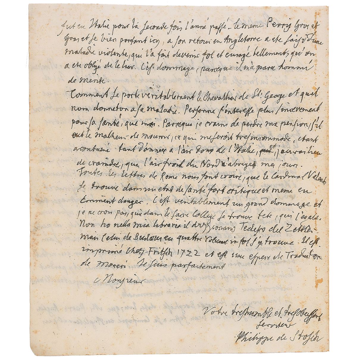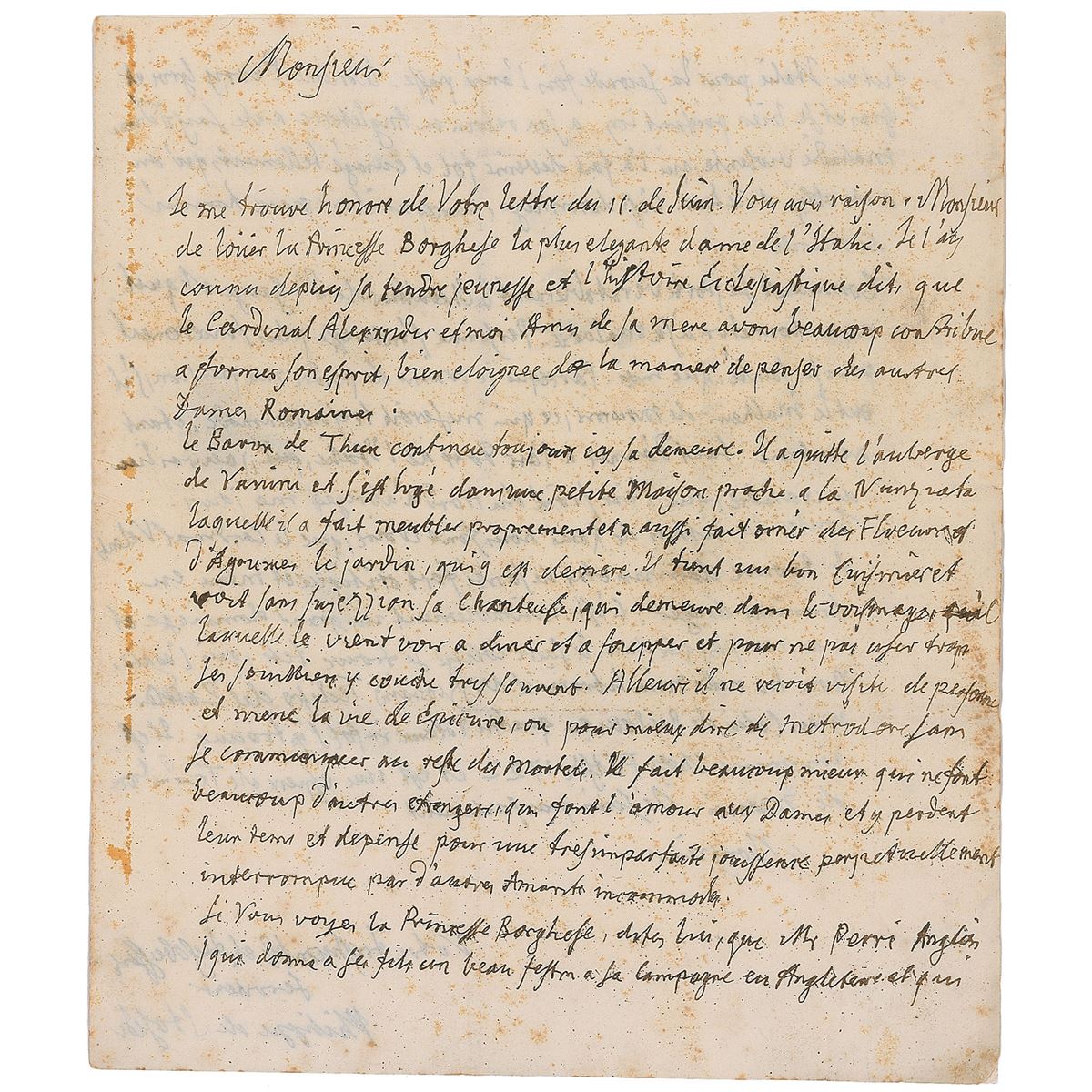 Notable Prussian antiquarian, art dealer, and collector who lived in Rome and Florence (1691–1752). ALS in French, one page both sides, 7.25 x 8.5, no date but circa 1750. Letter to a baron. In part (translated): "You are right, Monsieur, calling the Princesse Borghese the most elegant lady of Italy. I know her since her early life and ecclesiastical history claims that cardinal Alexander and I, friends of her mother, have contributed much in forming her mind…Baron de Thun is still living here…He has a good cook and meets his Chanteuse who lives in the neighborhood…He does much better than many other foreigners, who make love to the ladies and lose their time and money.” In very good condition, with intersecting folds, overall foxing, and a bit of show-through from writing to opposing sides. Accompanied by a later collector’s handwritten descriptions.
