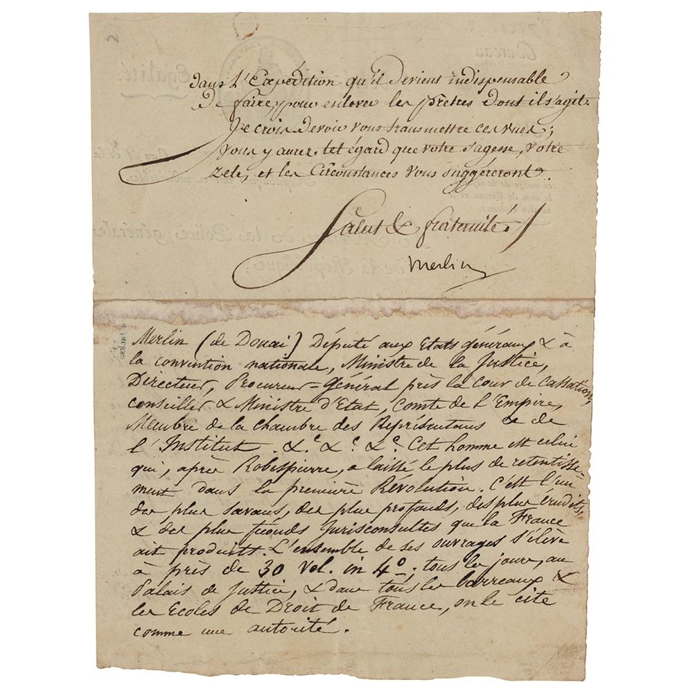 Politician and lawyer (1754–1838) of the French Revolution, who served as president of the National Convention in 1794, and of the Directory in 1798 and 1799; he voted for the execution of King Louis XVI. LS in French, signed “Merlin,†one page both sides, 9.75 x 9.25, Republique Francais letterhead, January 19, 1796. Letter to the Minister of War, asking that cavalry be sent to seize the priests in the Departement de l'Yonne. In very good to fine condition, with mounting remnants to the reverse, a biographical caption written below the conclusion in an unknown hand, and a rusty circular paperclip impression to the top.