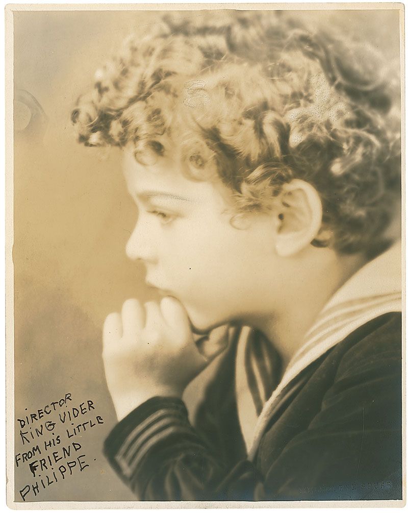 Silent film era child actor (1917–1995) who later went on to become a successful director and producer. Vintage sepia matte-finish 8 x 10 Melbourne Spurr photo, signed and inscribed in fountain pen “Director King Vider [sic] from his little friend Philippe.” In fine condition, with some scattered light silvering and some discoloration to background.