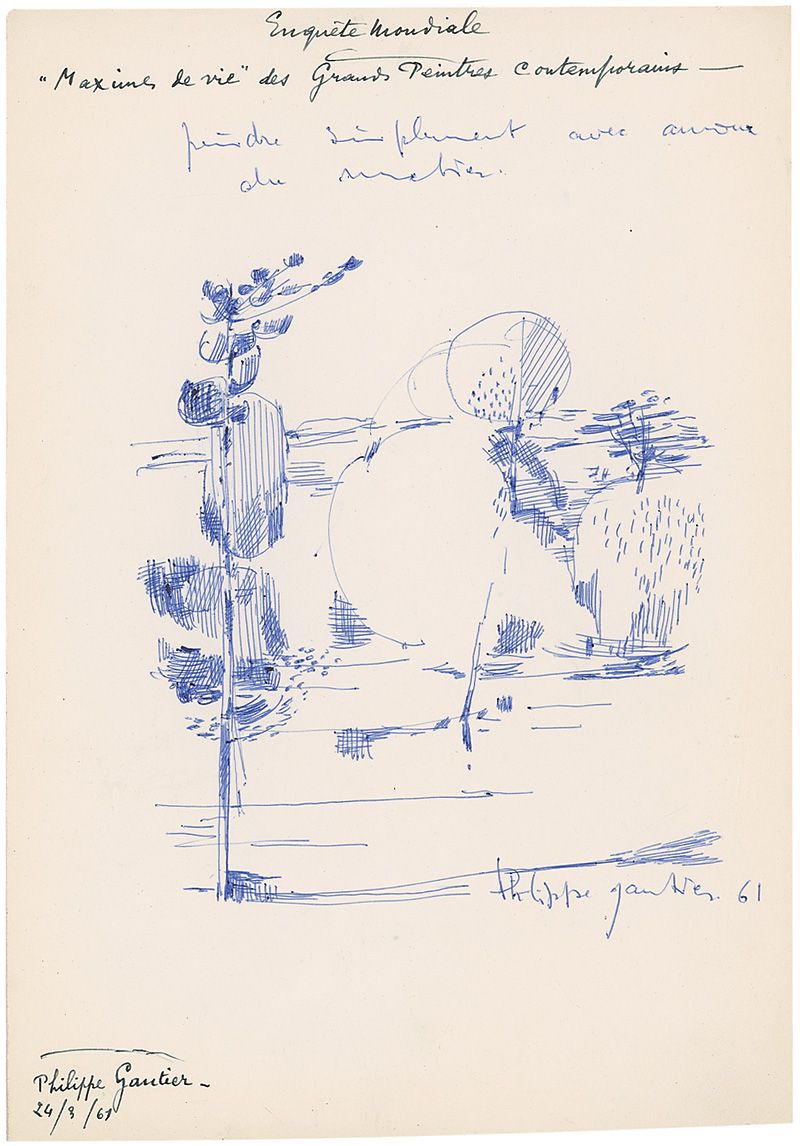 Original signed ballpoint sketch of a unique landscape with plants and trees on an off-white 8.25 x 11.75 sheet, signed underneath the image, “Philippe Gautier 61,” adding a French sentiment above the image which loosely translates to “To paint with love of the profession.” Sheet also contains collector’s notations to top and bottom. In fine condition, with some light creasing to top and bottom edges of sheet.