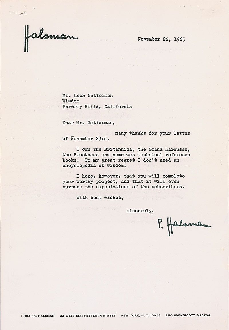 One of the world’s foremost portrait photographers (1906–1979), he produced 101 cover photos for Life magazine. TLS signed “P. Halsman,” one page, 7.25 x 10.25, personal letterhead, November 26, 1965. Letter to the publisher of Wisdom. In part: “I own the Britannica, the Grand Larousse, the Brockhaus and numerous technical reference books. To my great regret I don’t need an enclyclopedia of wisdom.” In fine condition, with slight edge toning and staple holes to top left corner.