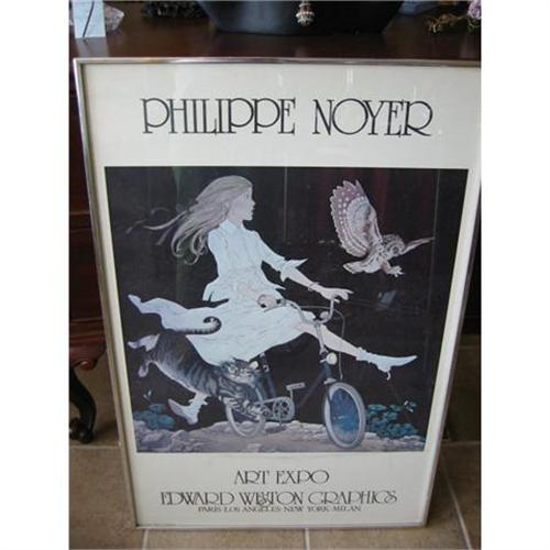 this magnificent serigraph is done by art expo. weston graphics New York, Paris, Los Angeles, Milan. on the lower right of this print, signature of artist Philippe Noyer is printed. the print has an interesting subject and magnificent color combintion. a girl is riding (almost)flying with her bike and scared of a bird, her cat is behind. this print has an aluminium frame covered with glass and is extremely heavy. on the back has very interesting writing by pen (looks like a person has this as a gift to his or her lover. (iamge may not be clear but gives an idea). in excellent condition. normal wear and tear. if interested glass and frame can be removed. however, i am not certain if can be rolled and will take chances to examine. this is how it came to my studio and will be handled with care. it measures including its frame 36 inches tall, 24 inches wide. very attractive, very collectible, very decorative. something to think about.