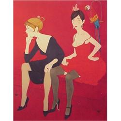 TWO SEATED WOMEN WITH PARROT, color lithograph, signed in pencil, numbered edition 220, image 32 1/2 x 25", full margins, small white paint specks on the surface, soft creases and stray ink marks in the margins. STARTING BID $20. ESTIMATE $20 TO $1000