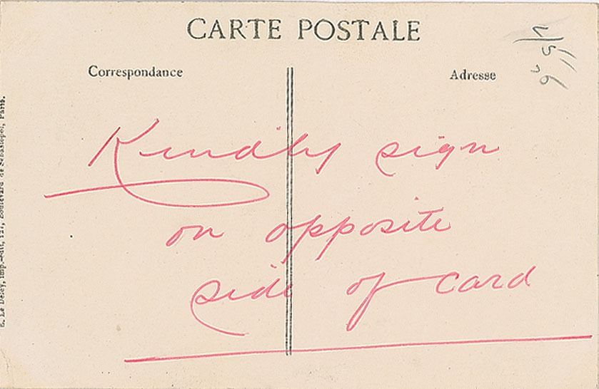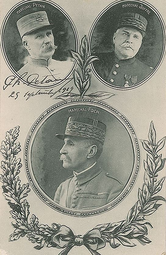 Vintage 3.25 x 5 postcard photo featuring France's heroic World War I marshals, signed in fountain pen, "Ph. Petain, 25 Septembre 1919." In fine condition.