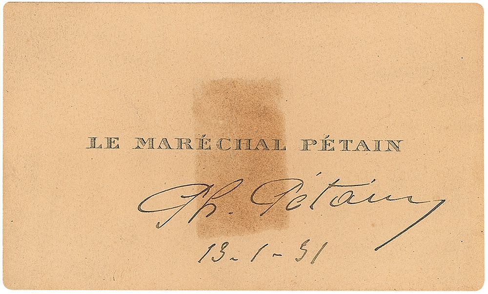 French general who was honored as a national hero for his defense of Verdun during World War I, but who was convicted after World War II of dealings with the enemy while head of the collaborationist Vichy regime. One of Petain’s personal calling cards, 4 x 2.25, signed on the front in black ink, “Ph. Petain 13-1-31.” In very good condition, with light overall toning with a heavier block of toning to center from tape remnant on reverse and a few bends.