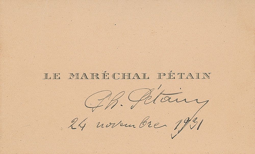 French general (1856–1951) who was honored as a national hero for his defense of Verdun during World War I, but who was convicted after World War II of dealings with the enemy while head of the collaborationist Vichy regime. Original personal calling card bearing Petain’s name and title, 4 x 2.5, signed in fountain pen, “Ph. Petain, 24 November 1931.” In fine condition.