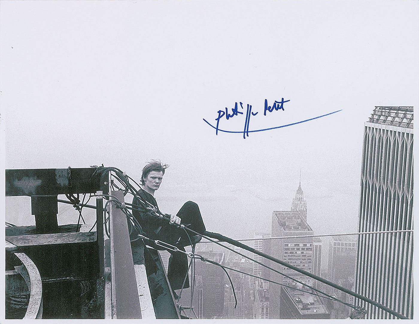Awesome 11 x 8.5 laserprint photo of Philippe Petit prior to his high-wire walk between the Twin Towers of the World Trade Center on the morning of August 7, 1974, signed in blue felt tip. In very fine condition.