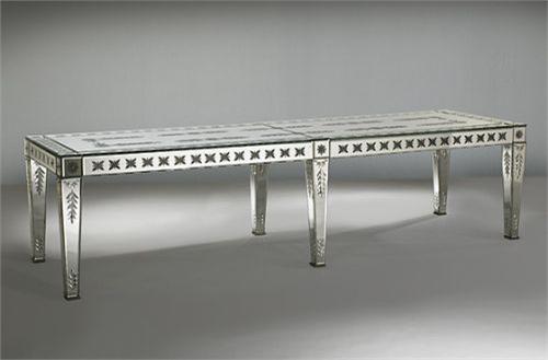 Philippe Starck custom dining table Thierry Duclos of Mirostyle, Paris USA, 2000 cut mirrored glass, glass over stainless steel frame 120 w x 36 d x 30.25 h inches This unique dining table was custom made for the Ian Schrager residence in New York. While minimalist in form, the ornately carved surface decoration and mirrored glass make this an excellent example of the Neo-Baroque style utilized by Starck for various commissions, including his work at the Hudson Hotel, New York (2000) and the Clift Hotel, San Francisco (2001). The table is internally lit and mounts to the floor. Provenance: Ian Schrager, New York | Private collection, New York