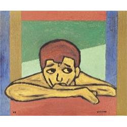 Philippe Visson (American/French, b. 1942), “Youth Leaning Against Still”, c. 1958; oil/canvas, 21” x 25”, signed and dated; titled on verso, with label from the Milch Gallery, NYC. This is an early work by Visson, who was painting in hotel bathrooms in Paris during this period.