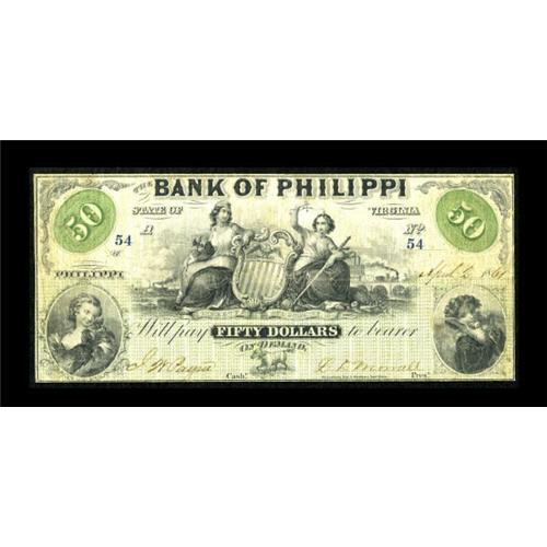 <B>Philippi, VA- The Bank of Philippi</B></I> $50 April 2, 1861 Jones BP40-32 G16a<BR> While lower denomination notes from this bank are quite easily found, that is certainly not the case for this $50 example, which is listed as rarity 7G in the Jones & Littlefield Virginia reference. This is the first specimen of its kind we've ever had to offer. <B>Fine.</B></I><BR><BR><b>Shipping:</b> Coins & Currency (<a target="_blank" href="http://www.heritageauctions.com/common/shipping.php">view shipping information</a>)