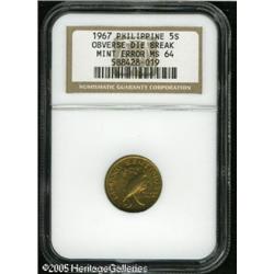 <B>Philippines 1967 Five Sentimos--Obverse Die Break--MS64 NGC.</B></I> KM-197. A large, leaf-shaped die break dominates the portrait of Melchora Aquino. The reverse center in sunken, since metal rushed to the die break during the strike. Unabraded, but a few small spots are present. Lot:11043