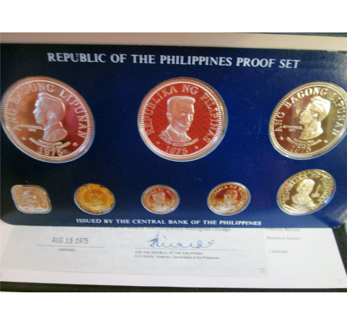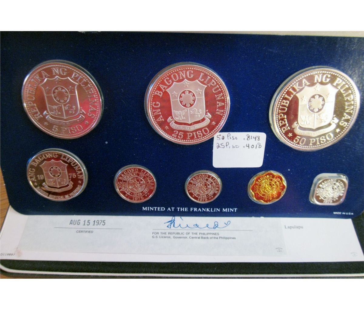 Philippines; 1975 Proof Set minted by Franklin Mint, 8 coins 25 & 50 Piso are silver. With case, sleeve and COA.