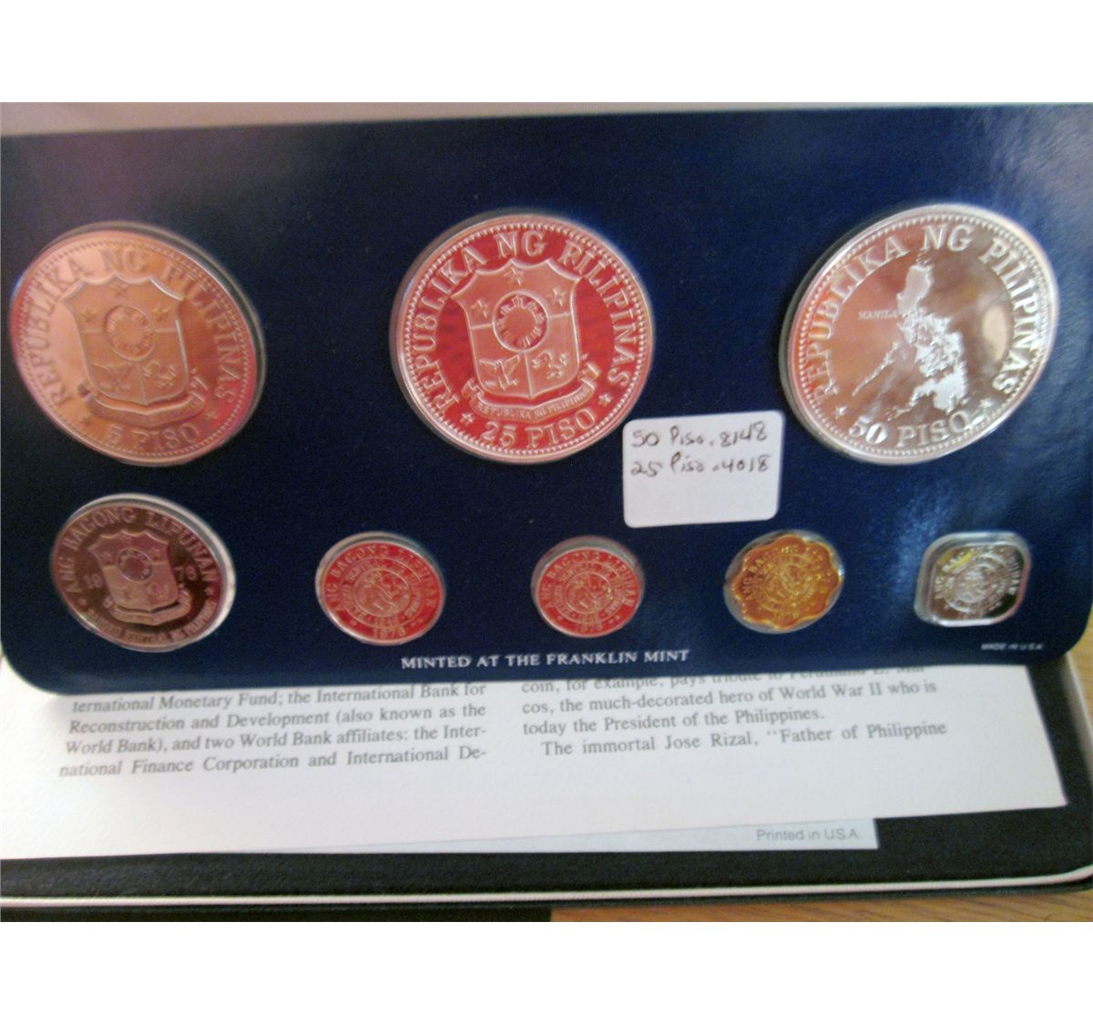 Philippines; 1976 Proof Set minted by Franklin Mint, 8 coins 25 & 50 Piso are silver. With case, sleeve and COA.