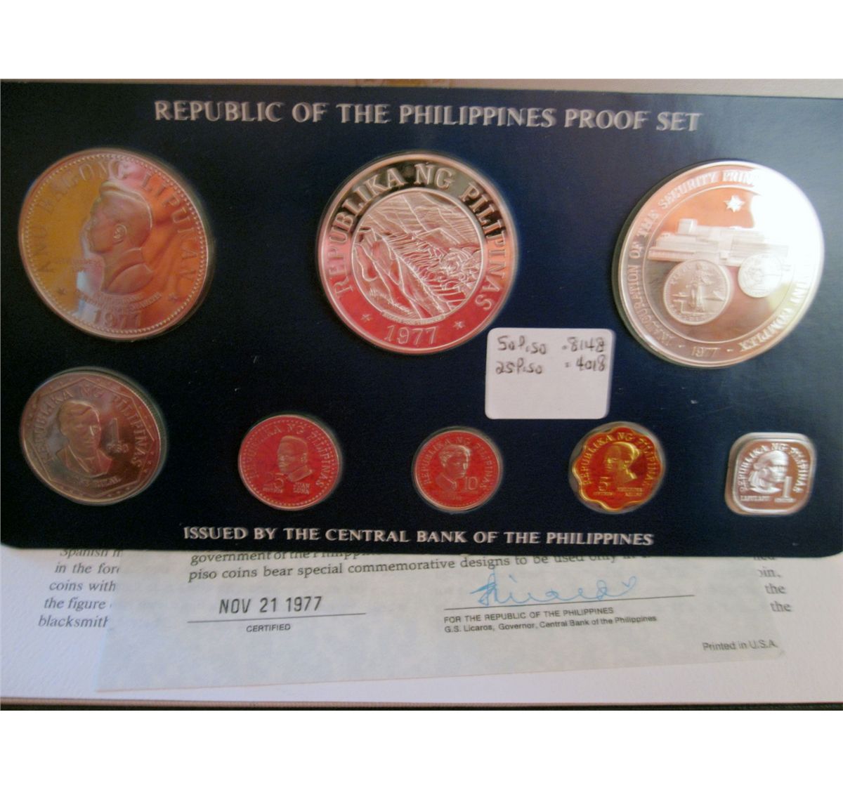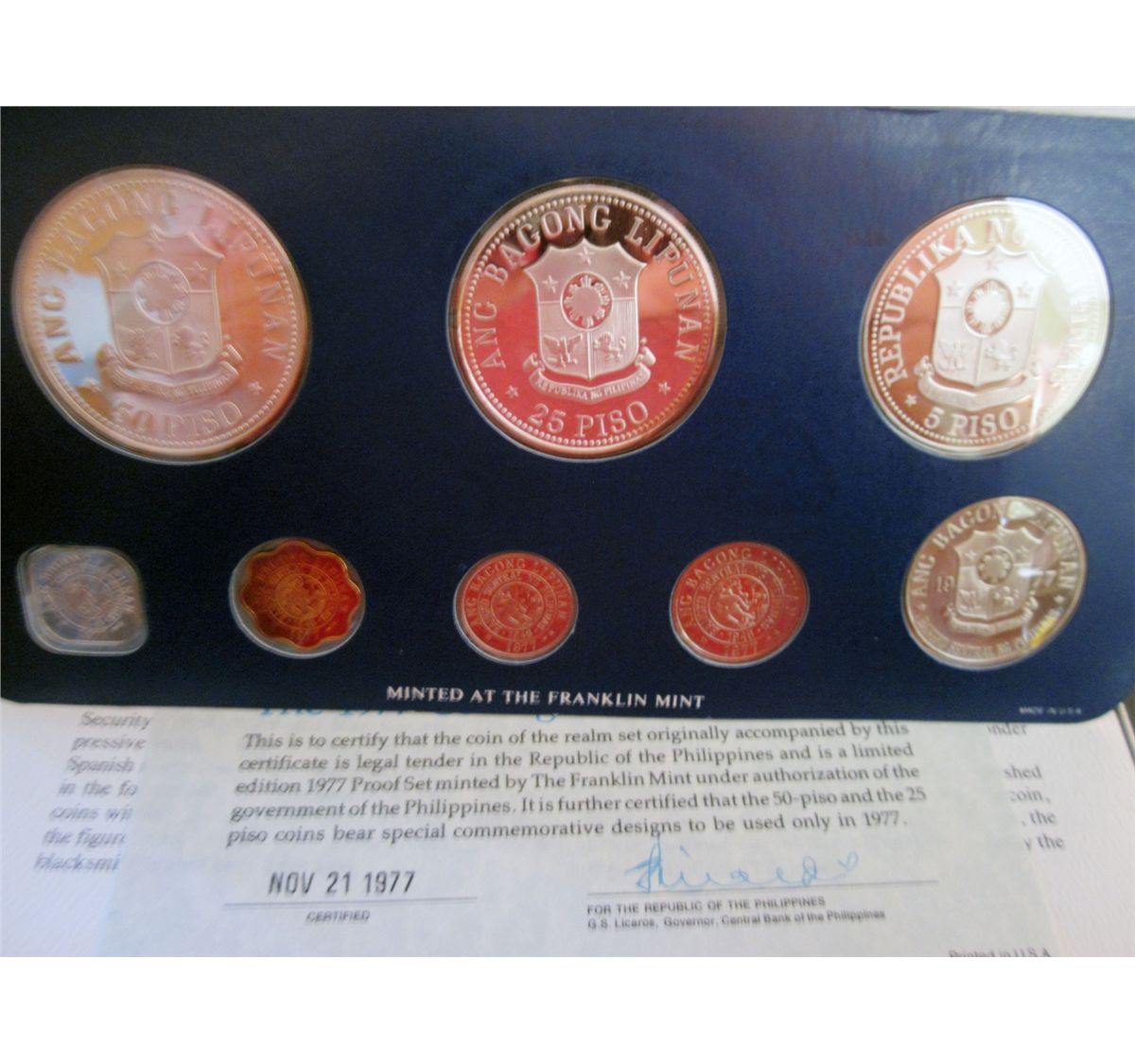 Philippines; 1977 Proof Set minted by Franklin Mint, 8 coins 25 & 50 Piso are silver. With case, sleeve and COA.