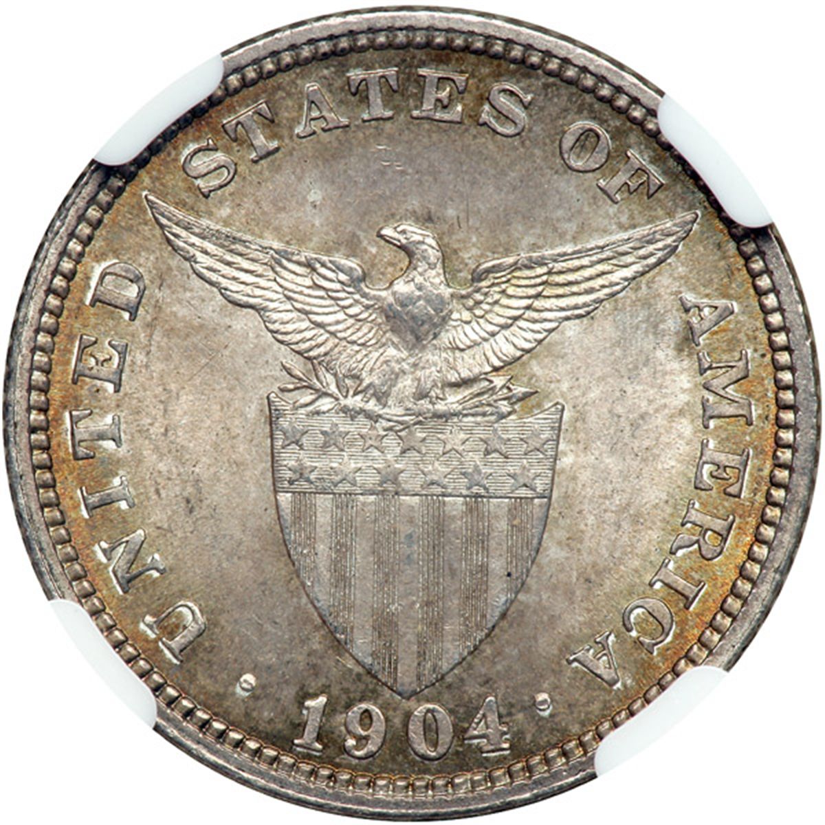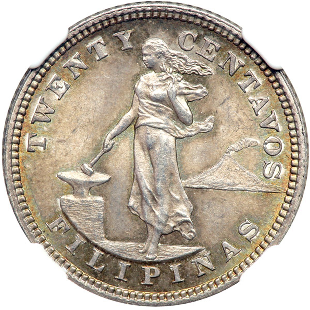 Philippines. 20 Centavos, 1904. KM-166. Beautiful toning. NGC graded MS-64.