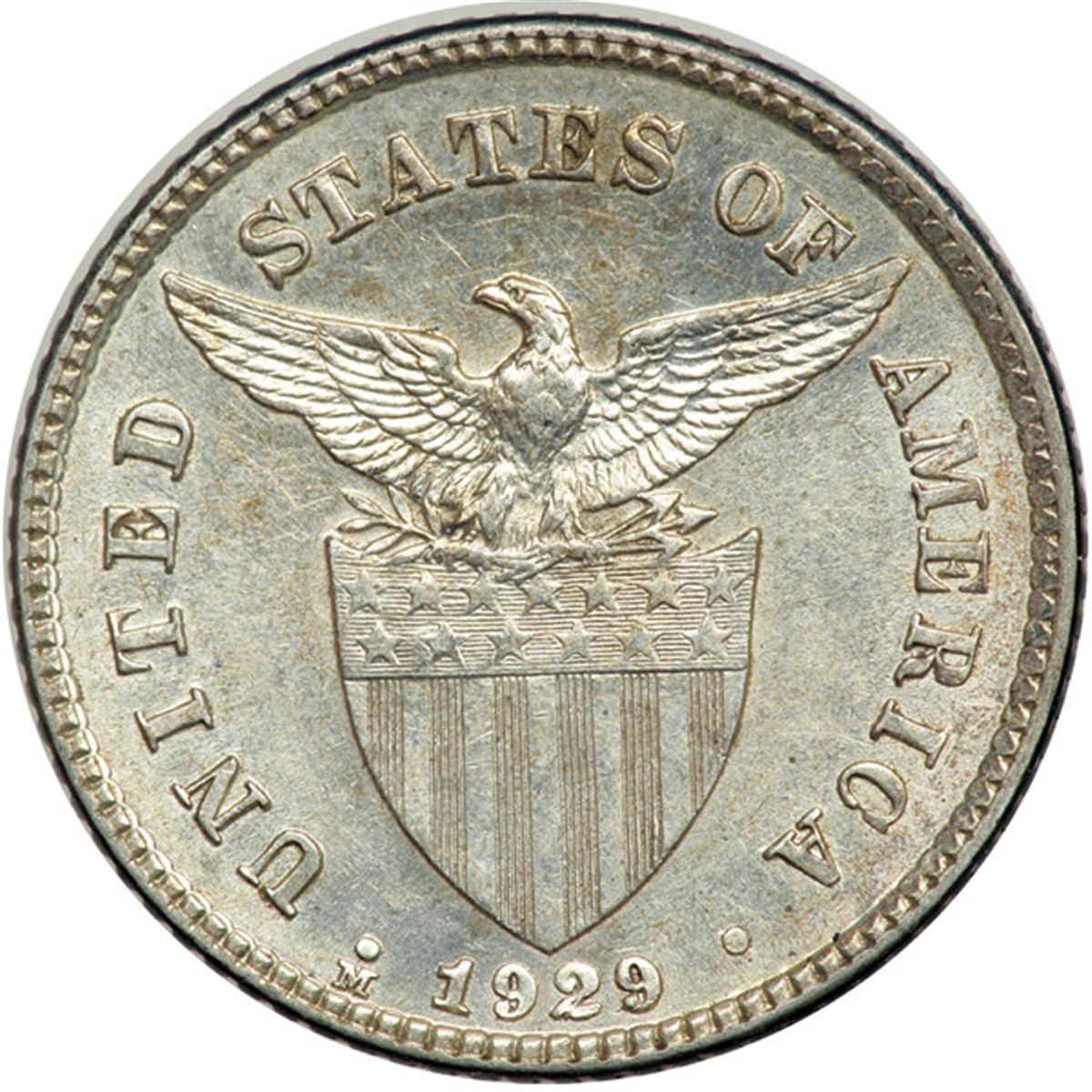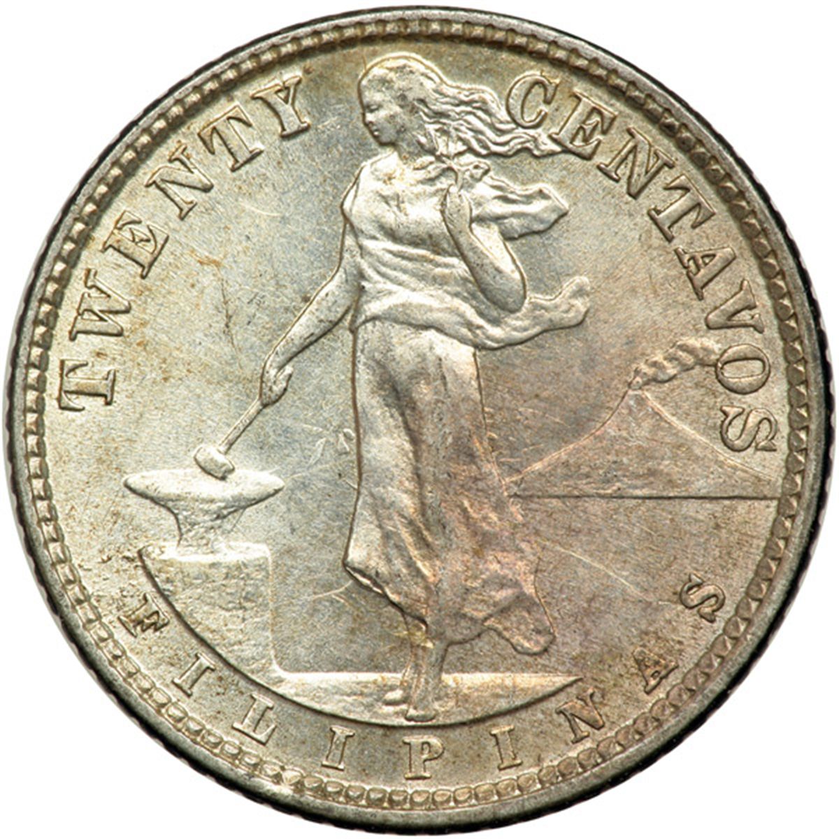 Philippines. 20 Centavos, 1929-M. KM-170; Allen 11.19B. Re cut 2. Uncirculated.