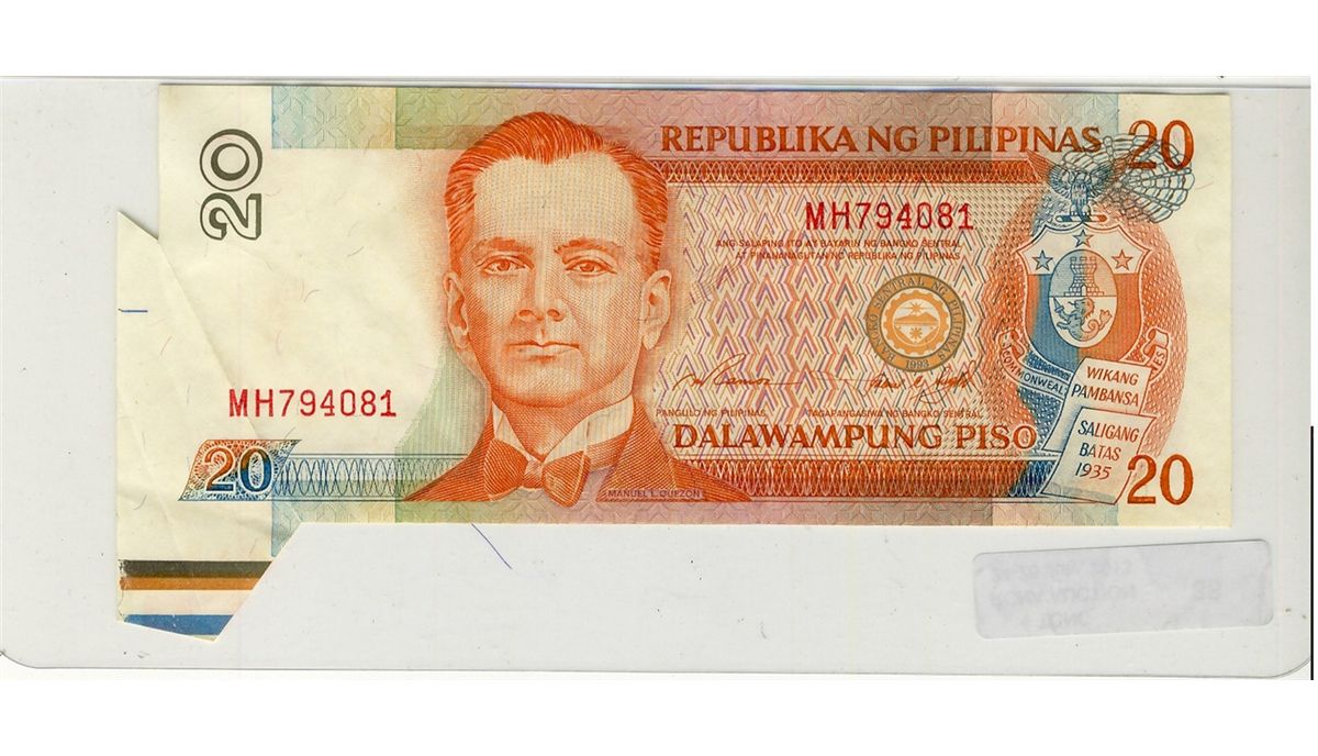 Philippines 20 Piso Error Note. Butterfly cut issue. EF.