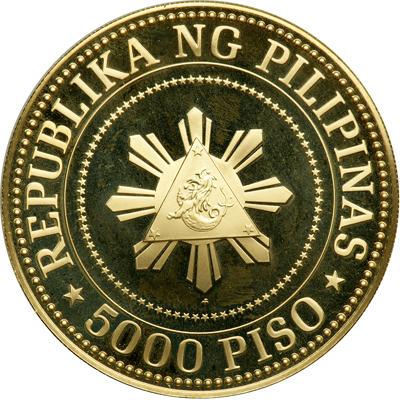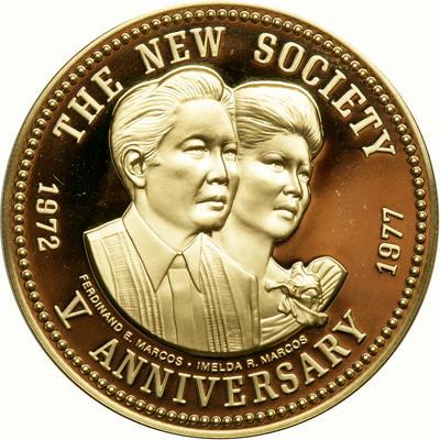 Philippines. 5000 Piso, 1977. KM-220; Fr-8. Weight 1.9890 ounce. 5th Anniversary of the New Society. Conjoined busts of Ferdinand and Imelda Marcos right. Reverse: Presidential seal. Mintage of 3,832 pieces. NGC graded Proof 69 Ultra Cameo, Too large for holder.