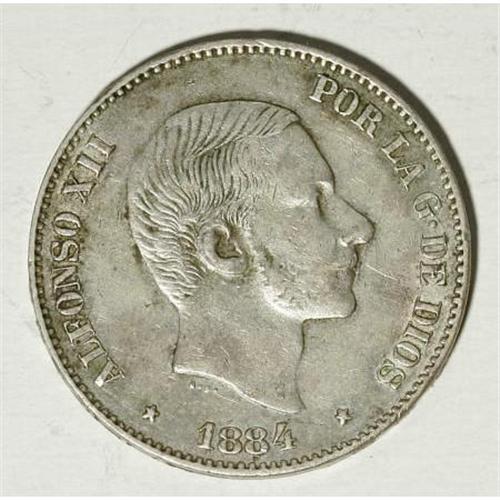 <B>Alfonso XII silver 50 Centimos 1884,</B></I> KM-150, About XF, "old gray" surfaces, sharp details, no noticeable marks.<BR><BR><b>Shipping:</b> Coins & Currency (<a target="_blank" href="http://www.heritageauctions.com/common/shipping.php">view shipping information</a>)