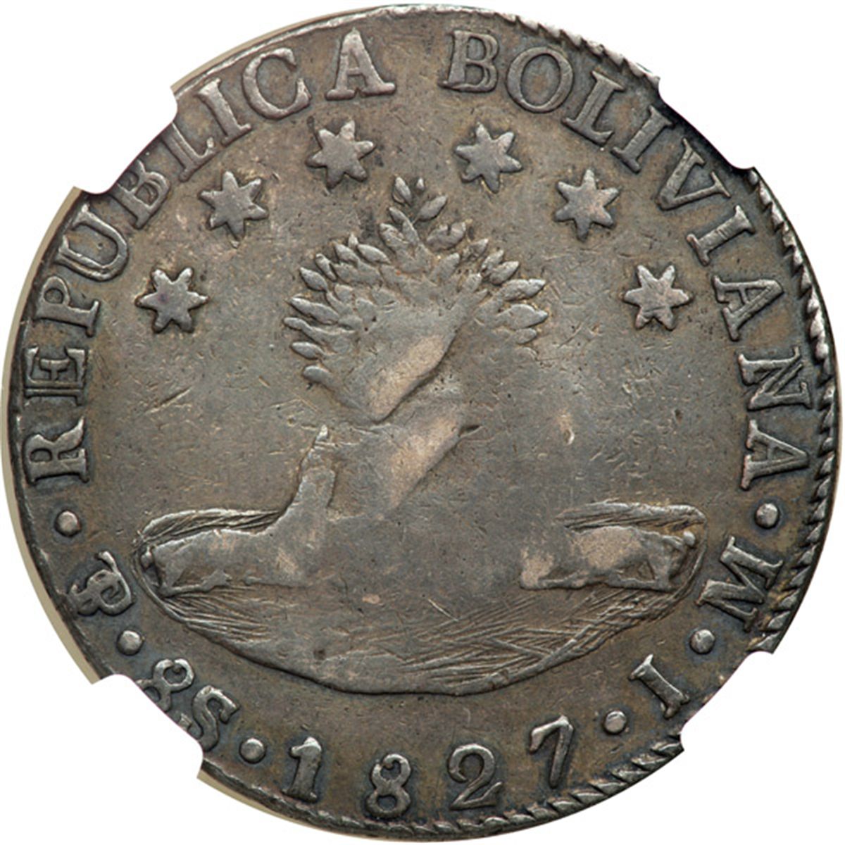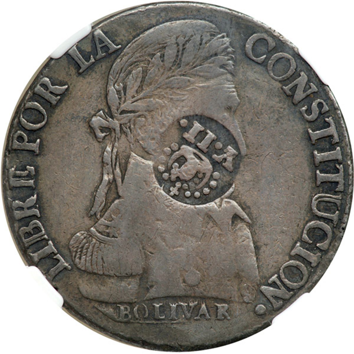 Philippines. Countermark 8 Reales, ND (1834-1837). KM-100. Y II counterstamp on Bolivia 8 Soles, 1827. NGC graded VF-25.