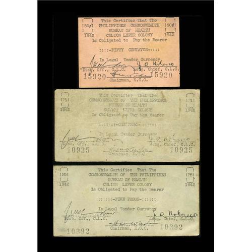 <B>Philippines</B></I> Culion Leper Colony 1942 First Issue 50¢, 1 Peso, 5 Pesos Pick S244a, S245, S246<BR>The 50 Centavo note grades <B>AU,</B></I> the One Peso grades <B>Fine,</B></I> and the Five Peso grades <B>XF/AU.</B></I> A difficult trio to assemble.<BR><BR><b>Shipping:</b> Coin/Currency (<a target="_blank" href="http://www.heritageauctions.com/common/shipping.php">view shipping information</a>)