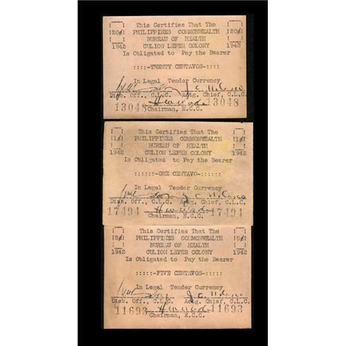 <B>Philippines</B></I> Culion Leper Colony 1942 Second Issue S251 - S253.<BR>This group contains an example from the one, five, and twenty centavos issue. The notes range in grade form <B>AU</B></I> to <B>CU</B></I> with only light corner bumps and wrinkles noticed. These carry the the Presidential authority clause on the back. No values are listed for grades above XF.<BR><BR><b>Shipping:</b> Coin/Currency (<a target="_blank" href="http://www.heritageauctions.com/common/shipping.php">view shipping information</a>)