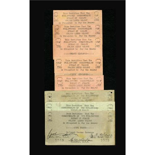 <B>Philippines Culion Leper Colony.</B></I><BR>First Issue 50 Centavos; 50/20 Centavos Error Note; 1 Peso; 5 Pesos; 20 Pesos 1942 Pick S244; S244x; S245; S246; S247<BR>Second Issue 1 Centavo; 5 Centavos; 20 Centavos 1942 Pick S251; S252; S253.<BR> This is a great set of this scarce World War Two Filipino guerilla paper money. The centavo notes grade <B>AU</B></I> or better, while the 1 Peso grades <B>XF,</B></I> punch cancelled, soiling, tiny hole; the 5 Pesos <B>AU,</B></I> with three small top edge tears; and the 20 Pesos grade <B>Fine,</B></I> shaved lower left corner. The Second Issue Centavos notes have the type-written presidential authority added to the back. None of these notes are priced above XF in the Krause reference. In fact, the 50/20 Centavos error note and the 20 Pesos notes are not priced in any grade. This is an important set of World War Two emergency paper money.<BR><BR><b>Shipping:</b> Coins & Currency (<a target="_blank" href="http://www.heritageauctions.com/common/shipping.php">view shipping information</a>)