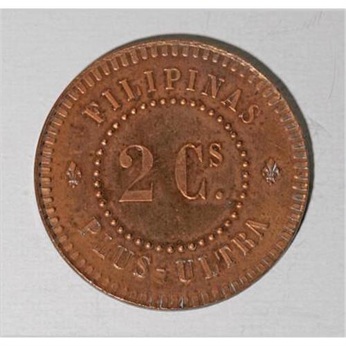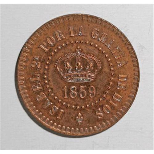 Isabella II bronze pattern 2 Centavos 1859, KM-Pn12, lightly cleaned Proof, reddish surfaces, sharp details, fairly rare.<BR><BR><b>Shipping:</b> Coins & Currency (<a target="_blank" href="http://www.heritageauctions.com/common/shipping.php">view shipping information</a>)