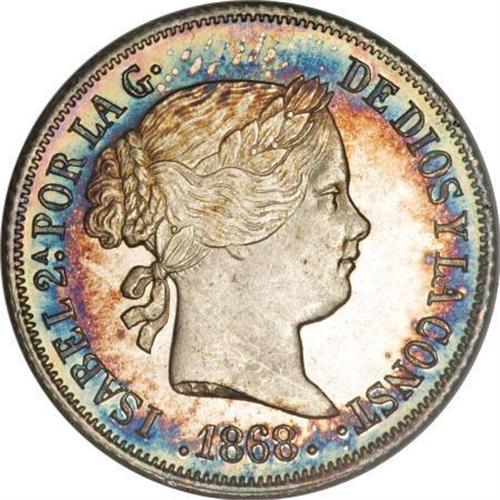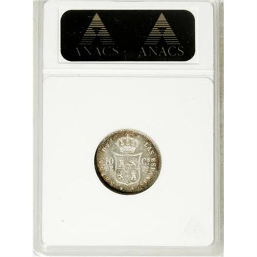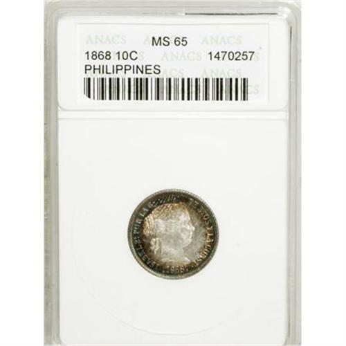 <B>Isabella II silver 10 Centimos 1868,</B></I> KM-145, last year of type, MS65 ANACS, brilliant centers with iridescent golden blue halo on each side.<BR><BR><b>Shipping:</b> Coins & Currency (<a target="_blank" href="http://www.heritageauctions.com/common/shipping.php">view shipping information</a>)