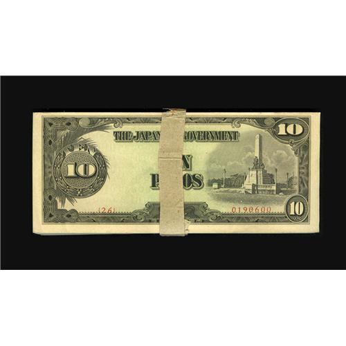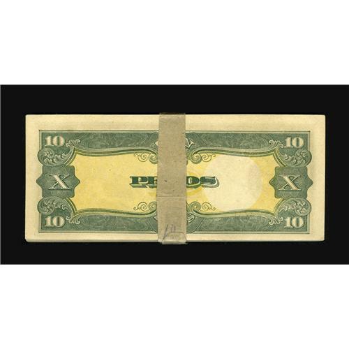 <B>Philippines</B></I> Japanese Government 1943 Ten Pesos Pick 111 Bank Wrapped 107 Note Pack.<BR>This pack contains seven replacement notes and 100 regular issue notes. Very scarce as such. <B>Crisp Uncirculated.</B></I><BR><BR><b>Shipping:</b> Coin/Currency (<a target="_blank" href="http://www.heritageauctions.com/common/shipping.php">view shipping information</a>)