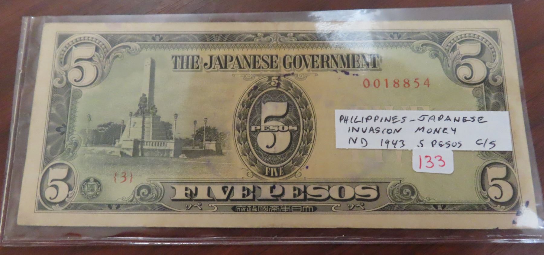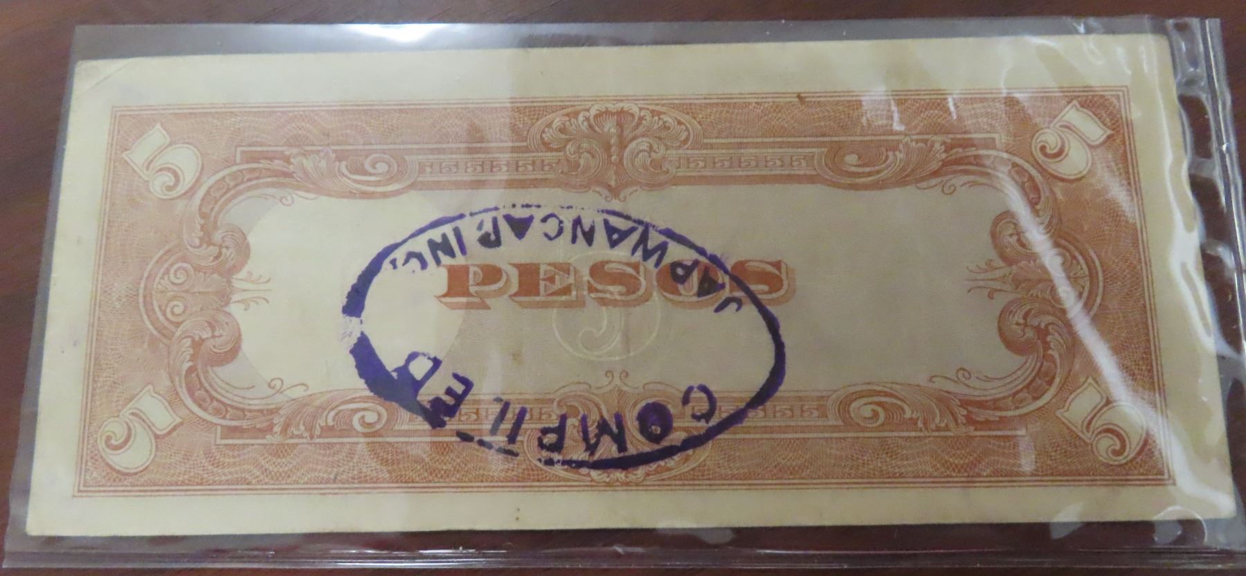 Philippines. Japanese Invasion Money. ND (1943) 5 Pesos. Counter-stamped on the back of the note. VF.