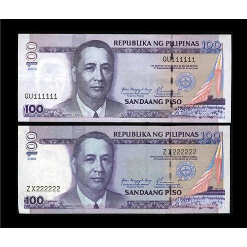 <B>Philippines</B></I> Republika Ng Pilipinas 2004 100 Pesos Pick 194a.<BR>Here is a neat pair of fancy serial numbers off the Central Bank. One note carries solid 1's and the other carries solid 2's. Both notes grade <B>Crisp Uncirculated</B></I> with a touch of handling present.<BR><BR><b>Shipping:</b> Coin/Currency (<a target="_blank" href="http://www.heritageauctions.com/common/shipping.php">view shipping information</a>)
