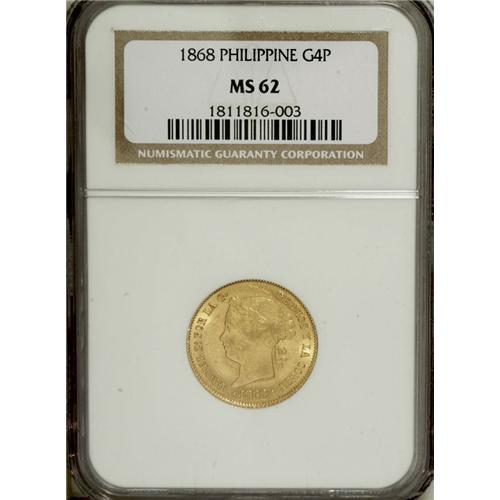 <B>Spanish Philippines. Isabella II gold 4-Pesos 1868,</B></I> KM-144, MS62 NGC, bright yellow gold, soft details on the queen's laurels and hairdo.<BR><I>From the Marrero Family Collection.</B></I><BR><BR><b>Shipping:</b> Coins & Currency (<a target="_blank" href="http://www.heritageauctions.com/common/shipping.php">view shipping information</a>)