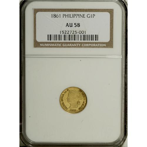 <B>Spanish Philippines. Isabella II gold 1 Peso 1861,</B></I> KM-142, AU58 NGC, light yellow gold.<BR><BR><b>Shipping:</b> Coins & Currency (<a target="_blank" href="http://www.heritageauctions.com/common/shipping.php">view shipping information</a>)