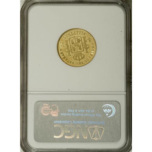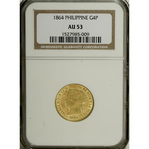 <B>Spanish Philippines. Isabella II gold 4 Pesos 1862,</B></I> KM-144, AU53 NGC, light yellow gold.<BR><BR><b>Shipping:</b> Coins & Currency (<a target="_blank" href="http://www.heritageauctions.com/common/shipping.php">view shipping information</a>)
