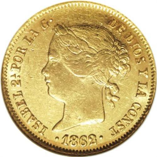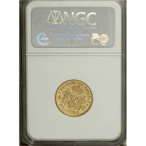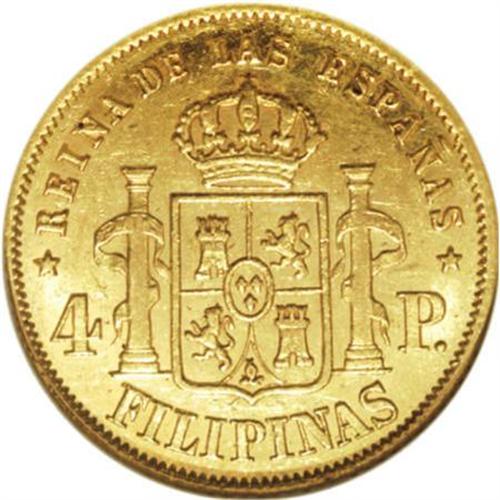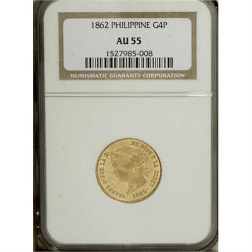 <B>Spanish Philippines. Isabella II gold 4 Pesos 1862,</B></I> KM-144, AU55 NGC, little abrasions but sparkling luster. <BR><BR><b>Shipping:</b> Coins & Currency (<a target="_blank" href="http://www.heritageauctions.com/common/shipping.php">view shipping information</a>)