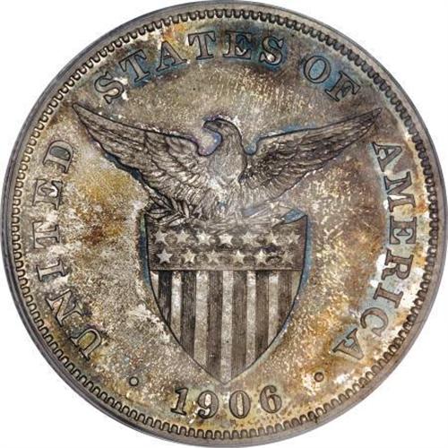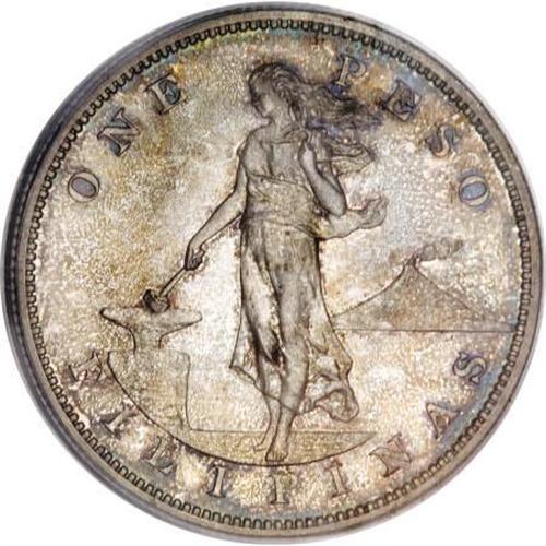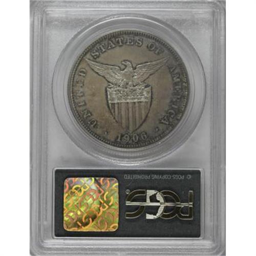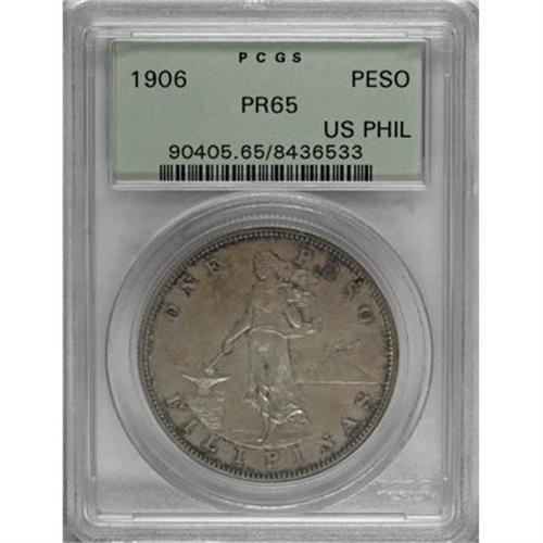 <B>USA Administration 1 Peso 1906,</B></I> KM-168, PR65 PCGS -- wow! A really gorgeous, original Gem Proof with delicate, somewhat mottled but appealing, golden brown and silvery gray iridescent toning having some bluish hues. Marvelous proof detail: every small feature shows fully, including Liberty's eye, fingers and toes, each strand of her flowing hair, the curlicues of the volcano's smoke, as well as every feather and facial detail of the eagle above the shield of the USA on reverse. A wonderful specimen! We think our top estimate will be blown away in this market.<BR><BR><b>Shipping:</b> Coins & Currency (<a target="_blank" href="http://www.heritageauctions.com/common/shipping.php">view shipping information</a>)