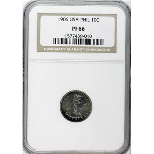 <B>USA Administration 10 Centavos 1906,</B></I> KM-165, proof mintage of 500 pieces, PR66 NGC, a superb coin with deep iridescent amber and seagreen toning, usual wonderful strike -- outstanding eye appeal.<BR><I>From The Madison Collection.</B></I><BR><BR><b>Shipping:</b> Coins & Currency (<a target="_blank" href="http://www.heritageauctions.com/common/shipping.php">view shipping information</a>)