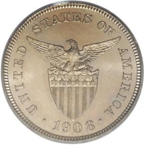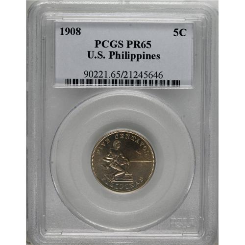 <B>USA Administration 5 Centavos Proof 1908,</B></I> KM-164, PR65 PCGS, a Gem Proof example with nearly perfect nickel surfaces, brilliant beneath pale golden toning. Value is difficult to estimate considering how hot the Philippines market is, and in light of the staggering prices achieved for nice examples in our January NYI auction. This coin deserves to soar past our high estimate because of its quality.<BR><BR><b>Shipping:</b> Coins & Currency (<a target="_blank" href="http://www.heritageauctions.com/common/shipping.php">view shipping information</a>)