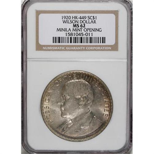 <B>USA Administration Wilson Dollar 1920,</B></I> HK-449, so-called dollar collected both by Philippines collectors and by U.S. coin and dollar enthusiasts, a nice piece, MS62 NGC, strong cartwheel luster and choice Uncirculated with pleasing surfaces having light iridescent gold toning over silvery brilliant luster. Struck to celebrate the opening of the Manila Mint during the administration of President Wilson.<BR><BR><b>Shipping:</b> Coins & Currency (<a target="_blank" href="http://www.heritageauctions.com/common/shipping.php">view shipping information</a>)