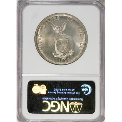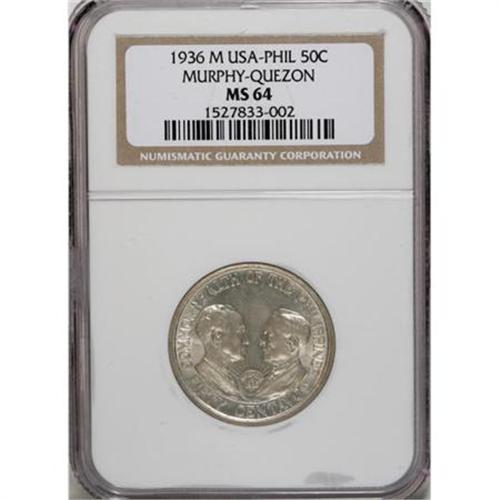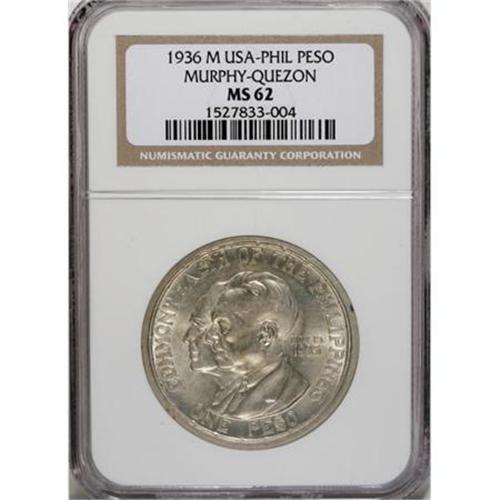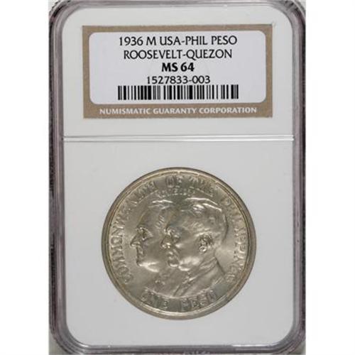 <B>USA Administration slabbed 1936 set:</B></I> 50 Centavos Murphy-Quezon 1936-M MS64 NGC, Peso KM-177 Roosevelt-Quezon 1936-M MS64 NGC, and Peso KM-178 Murphy-Quezon 1936-M MS62 NGC, all pleasing pieces with brilliant surfaces.<BR><BR><b>Shipping:</b> Coins & Currency (<a target="_blank" href="http://www.heritageauctions.com/common/shipping.php">view shipping information</a>)