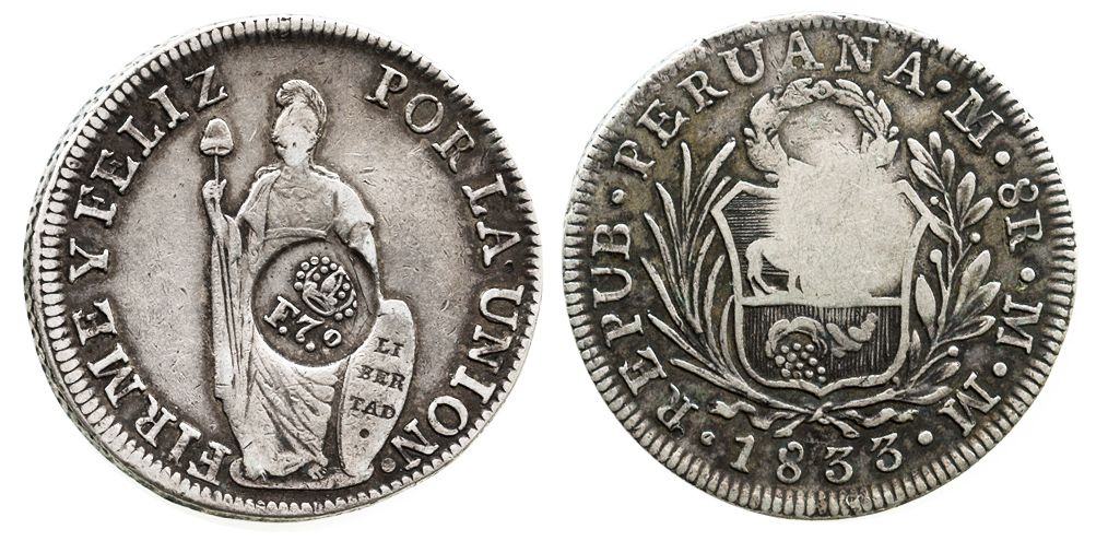 Philippines (under Spain), 8 reales, Ferdinand VII, crowned "F.7.o" countermark (1832-34) on a Lima, Peru, 8 reales, 1833MM. KM-83. 27.0 grams. Bold VF with nice toning, parts of rims crude (as made), bold full countermark.