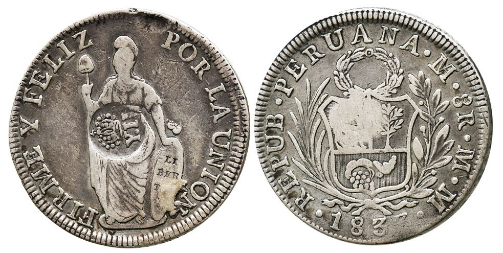 Philippines (under Spain), 8 reales, Isabel II, crowned "Y.II" countermark (1834) on a Lima, Peru, 8 reales, 1833MM. KM-138.2. 26.6 grams. Lightly toned VF with partially weak date and somewhat crude rims (as made), full countermark.