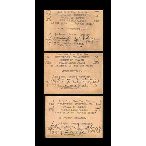 <B>Philippines</B></I> Culion Leper Colony 1942 Second Issue 1¢, 5¢, 20¢ Pick S251,S252,S253<BR>Another trio of these specialized issues. Unpriced in the Krause reference above XF, this group is a touch better than the last grading <B>Choice Crisp Uncirculated.</B></I><BR><BR><b>Shipping:</b> Coin/Currency (<a target="_blank" href="http://www.heritageauctions.com/common/shipping.php">view shipping information</a>)