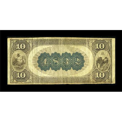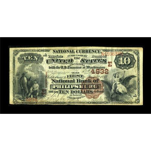 <B>Philipsburg, PA</B></I> - $10 1882 Brown Back Fr. 486 <B>The First NB</B></I> Ch. # (E)4832<BR> Long before modern research indicated that several hitherto unnoticed signature combinations were in fact prohibitively rare, the Rosecrans-Morgan combination on Brown Backs was a well established National Bank Note rarity. While the $5 has become somewhat more available in recent years, the $10 is still quite scarce, with a population of about a dozen or so, and the $20 is still extremely rare. This attractive example is the only Fr. 486 known from this bank. Pen signed <B>Fine-Very Fine.</B></I><BR><I>From The Thomas M. Flynn Collection</B></I><BR><BR><b>Shipping:</b> Coins & Currency (<a target="_blank" href="http://www.heritageauctions.com/common/shipping.php">view shipping information</a>)