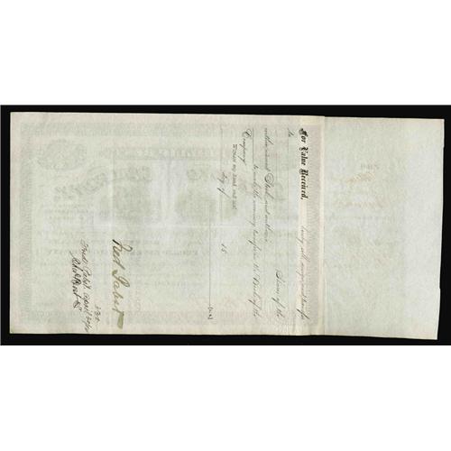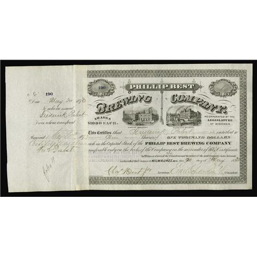 <B>Phillip Best Brewing Company. 1 Share</B></I><BR>Frederick Pabst (1836-1904), and Charles Best, Brewers. Both sign this 1873 Wisconsin stock. This great stock is issued to Fred Pabst and is boldly signed at back. Nice double vignette of the Empire and Southside breweries, the company's two breweries in Milwaukee. This company is the forerunner of what eventually became Pabst Brewing Company. Jacob Best was among the first brewers to engage in the business in Milwaukee, Wisconsin, establishing a plant in 1844. His son Phillip rose to take control of the brewery by 1860, and ultimately retiring in 1864, leaving it to his son-in-laws, Emil Schandein, who signs as Secretary, and Fred Pabst, signing stub and back. With Fred at the helm of the company, Pabst rose to become the largest brewery in the world by the turn of the century. Stocks of significant breweries of this caliber signed by the early important brewers in the U. S. are extremely rare and this represents a nice opportunity to acquire an important certificate from this industry. <B>Extremely Fine.</B></I>