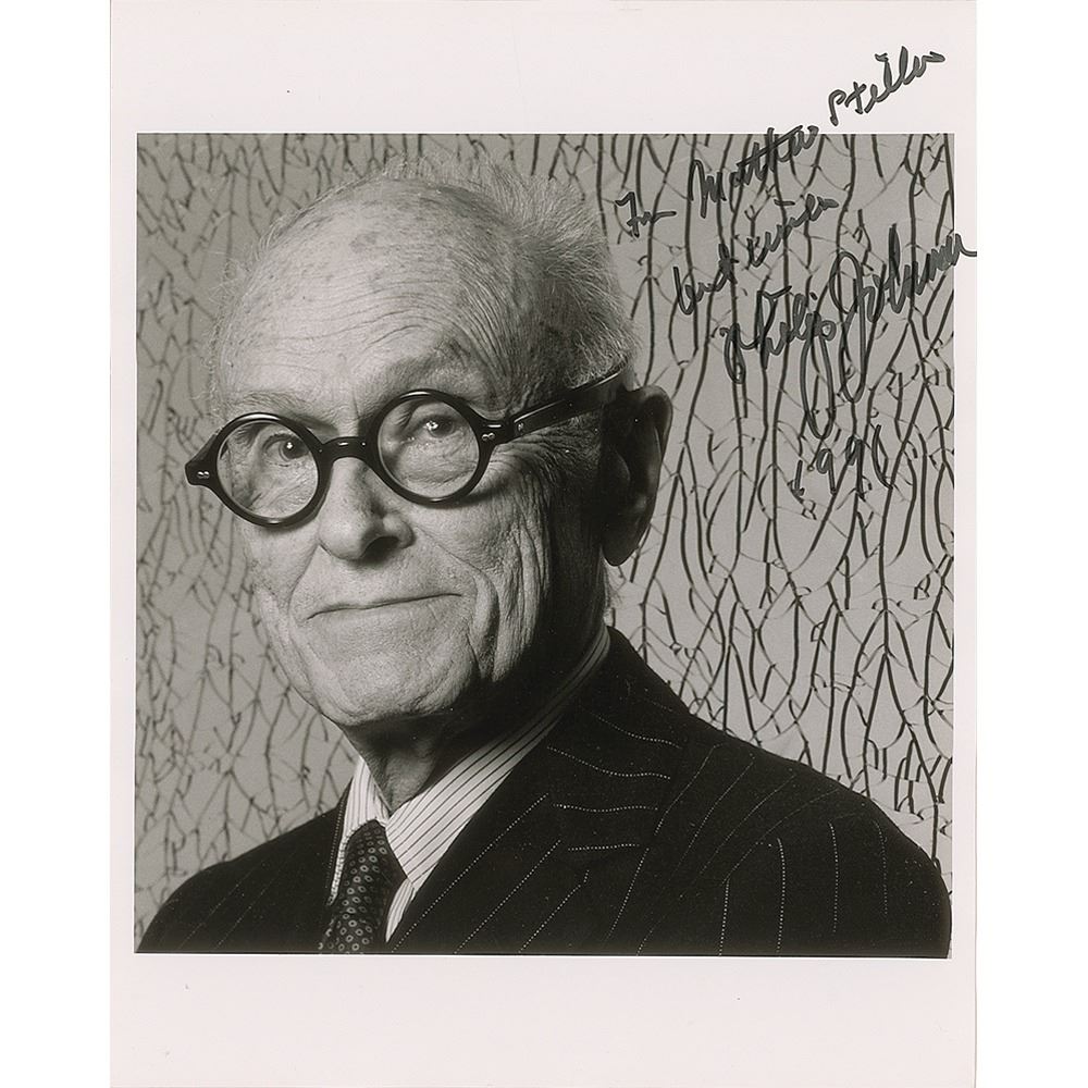 American architect (1906–2005) who is best known for his works of modern architecture, including the Glass House in New Canaan, Connecticut, and his works of postmodern architecture; in 1978, he was awarded an American Institute of Architects Gold Medal, and in 1979, the first Pritzker Architecture Prize. Matte-finish 8 x 10 head-and-shoulders portrait of the visionary architect, signed and inscribed in black felt tip, and dated 1991. Reverse bears a Luca Vignelli credit stamp. In fine condition, with rippling along the side edges.