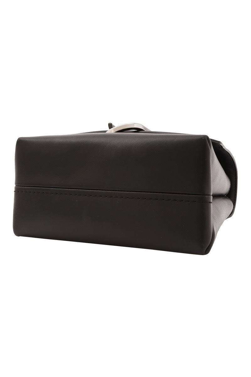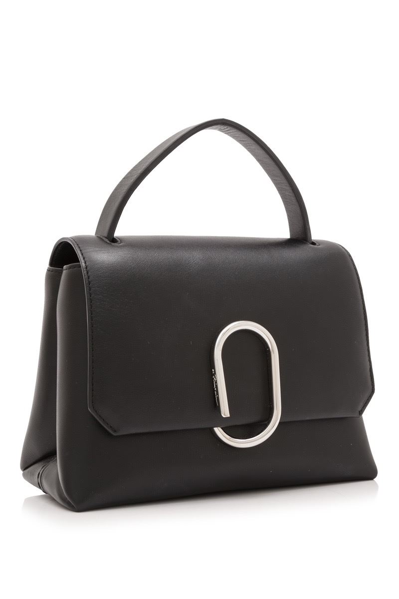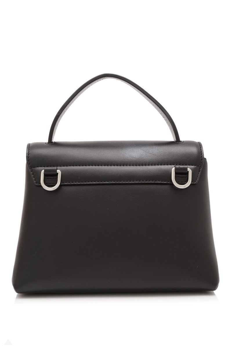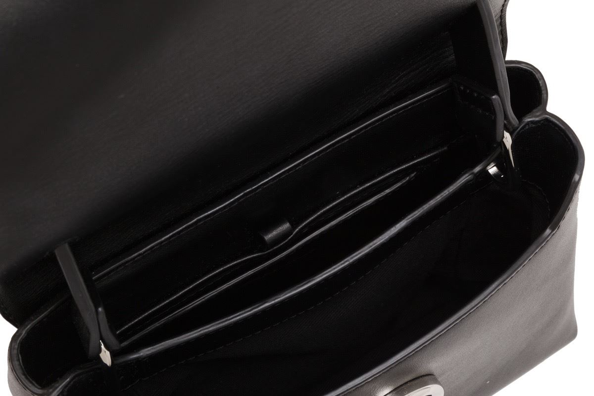 The Alix Mini Top Handle satchel features leather body with grommet and metal details, a leather handle, a detachable flat strap, a front flap with a metal detail, and interior slip pockets. Leather x Others Black x Silver Size: 16 x 21 x 10 Card: NO Made in: United States of America