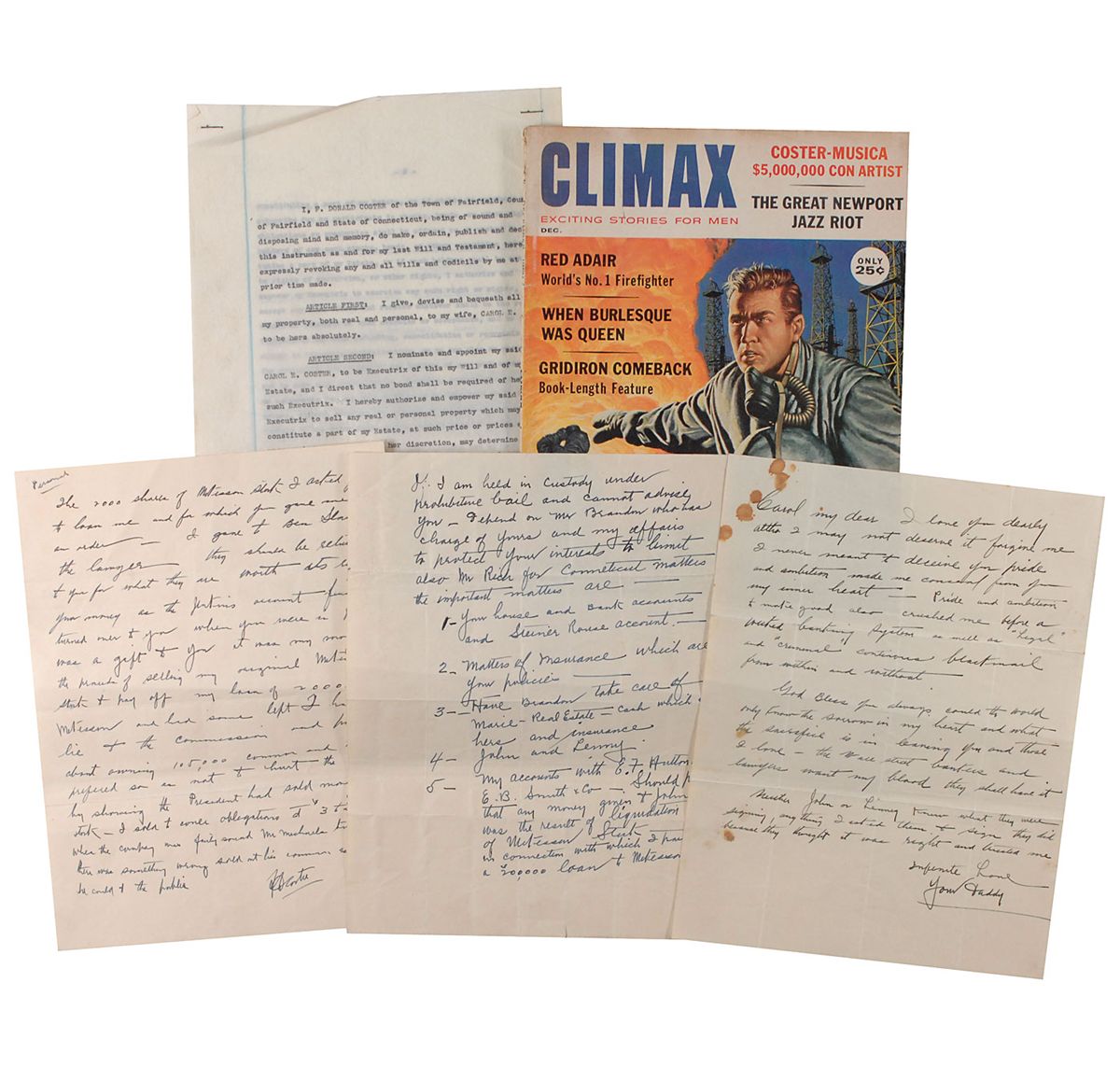 Also included is his Social Security card, issued on December 14, 1936; a copy of Coster’s will, signed in type, dated March 11, 1937, in which he bequeaths all of his property to his wife, Carol E. Coster; and a December 1960 issue of Climax magazine, featuring an article entitled “Coster–Musica—America’s $5,000,000 Con Artist.” In overall very good to fine condition.